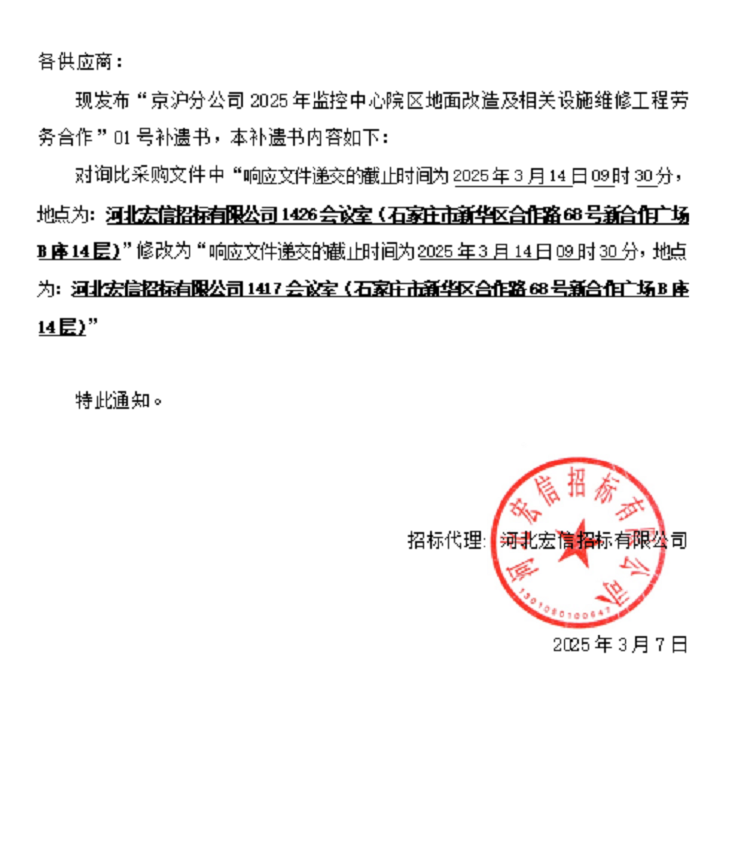 项目名称:京沪分公司2025年监控中心院区地面改造及相关设施维修工程劳务合作采购单位:河北邦达路桥工程有限公司联系单位:河北宏信招标有限公司联系电话:18831